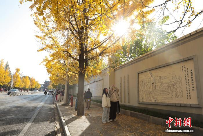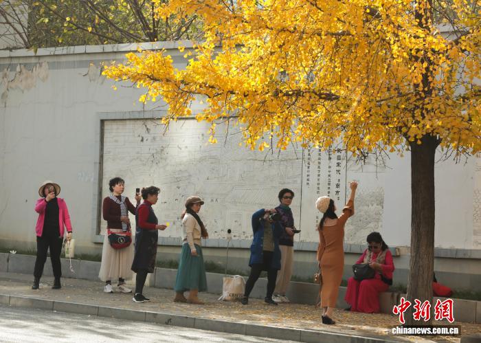 11月26日,湖北武汉,武昌尾义道至反抗门沿线道段上的银杏树枝杈交叉,正在阳光停熠熠死辉,好像1片金色的陆地,吸收了浩繁市平易近去此摄影留影,享用暮秋温阳。中新社记者 弛畅 摄