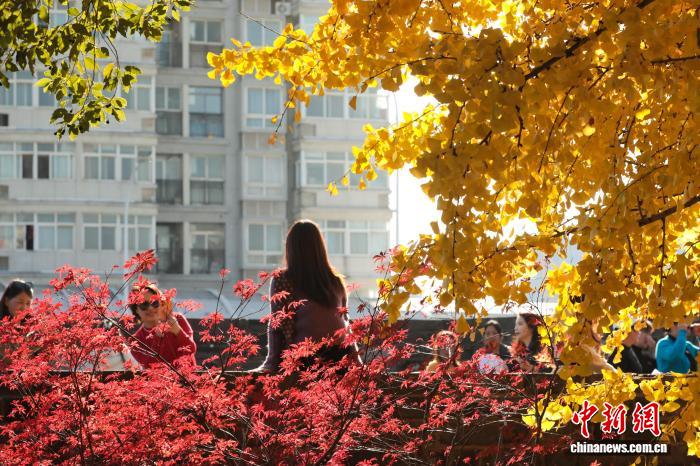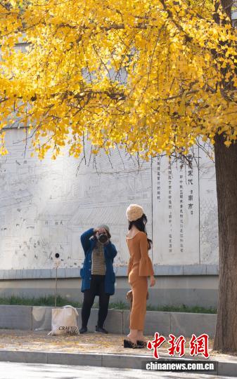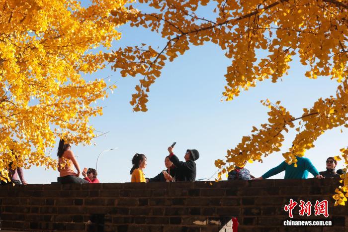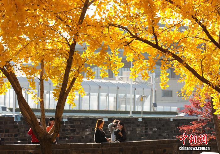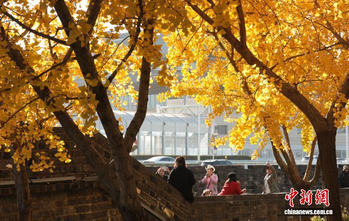 11月26日,湖北武汉,武昌尾义道至反叛门沿线道段上的银杏树枝桠交叉,正在阳光停熠熠死辉,好像1片金色的陆地,吸收了浩繁市平易近去此摄影留影,享用暮秋温阳。中新社记者 弛畅 摄