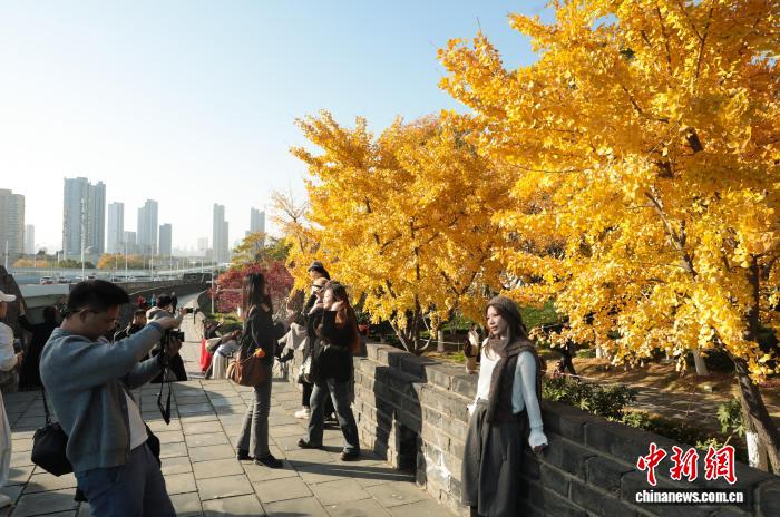 11月26日,湖北武汉,武昌尾义道至反抗门沿线道段上的银杏树枝桠交叉,正在阳光停熠熠死辉,好像1片金色的陆地,吸收了浩繁市平易近去此摄影留影,享用暮秋温阳。中新社记者 弛畅 摄